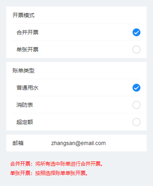 7、您可以根据需要选择合并开票或者单张开票,选择账单类型,同样也可以修改接收邮箱,确认无误后点击选择账单