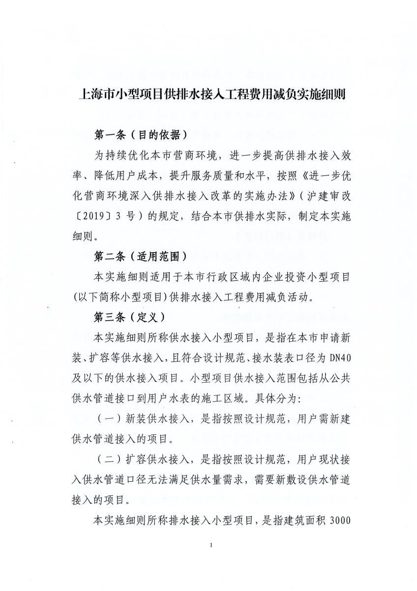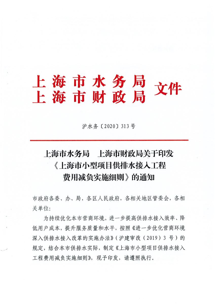 上海市水务局上海市财政局关于印发《上海市小型项目供排水接入工程费用减负实施细则》的通知